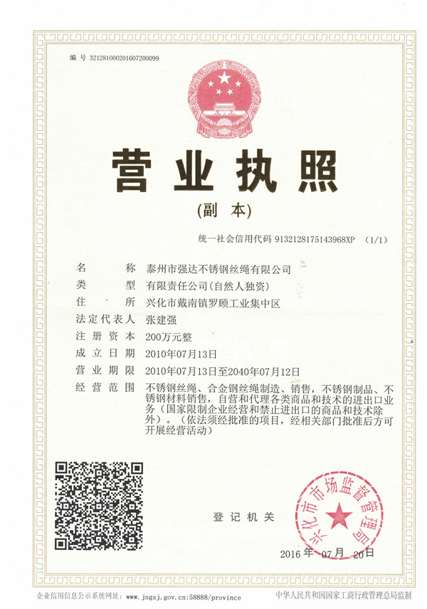 泰州市強達不銹鋼絲繩有限公司位于江蘇興化市戴南經濟開發區,公司致力于不銹鋼絲繩產品生產,立志成為“國內技術標桿型吊索具生產企業”。以此戰略思想指導,公司堅決貫徹“質量贏市場,管理增效益,誠信贏天下”的質量方針。以完善的服務在國內不銹鋼絲繩市場樹立良好的品牌形象。公司榮獲“江蘇省質量信得過企業。     靈活的管理機制,經驗豐富的